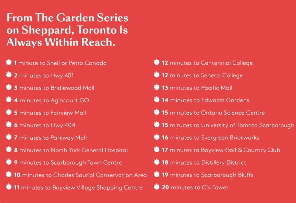 Sheppard Garden Condos provides unbeatable transit access, with several TTC bus routes just steps away from your front door. Residents will enjoy quick and easy connections to nearby subway stations and GO Transit lines, making commuting throughout Toronto and the surrounding areas effortless. Additionally, the development is conveniently located near major highways, including Highways 404 and 401. Motorists will be able to reach downtown Toronto in just 20 minutes, enhancing the convenience of daily life.