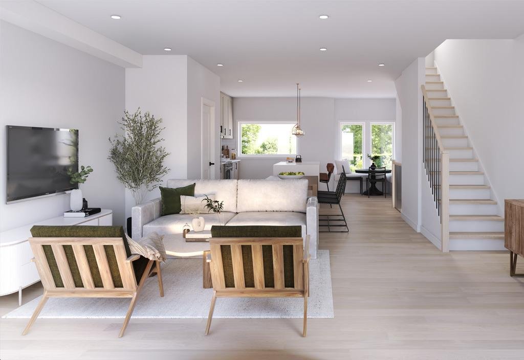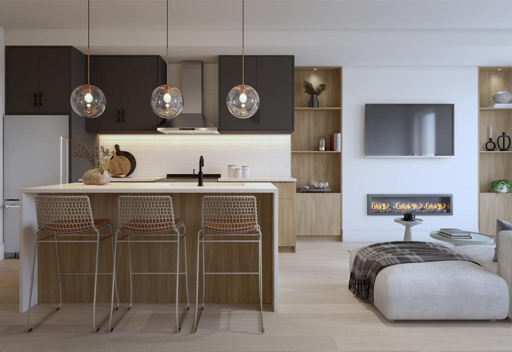 The architecture of the *Highgrove II* townhomes combines traditional materials with modern lines and details, offering a unique blend of style. The beautifully landscaped exteriors create a welcoming atmosphere, making it an inviting place to call home. The townhomes range from 1,280 to 2,064 square feet, with soaring 9-foot ceilings and impeccable finishes. Each home features a private balcony, and the interiors are thoughtfully designed to provide both design-forward aesthetics and functional layouts that cater to modern living.
