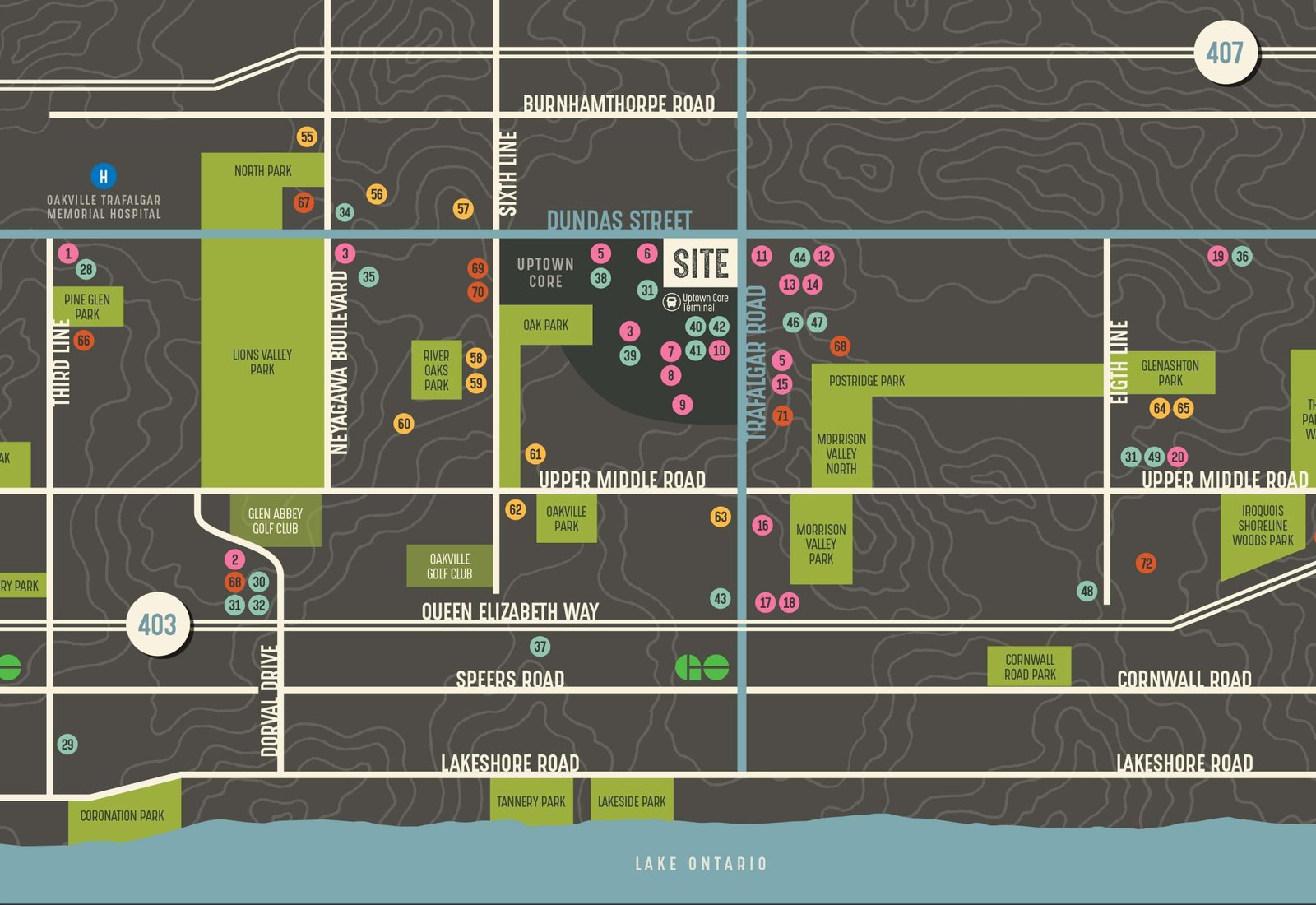 **Oak & Co Condos** offers great **walkability**, with a **walk score of 70/100**. It is located in a community that balances urban convenience with natural beauty. For commuters, **GO Transit bus stops** are conveniently located at **Trafalgar Rd & Dundas St E**, and **Oakville GO Station** is just a short drive away, providing easy access to **downtown Toronto** and beyond. Perfect for those who work in the city but prefer a more relaxed suburban lifestyle.