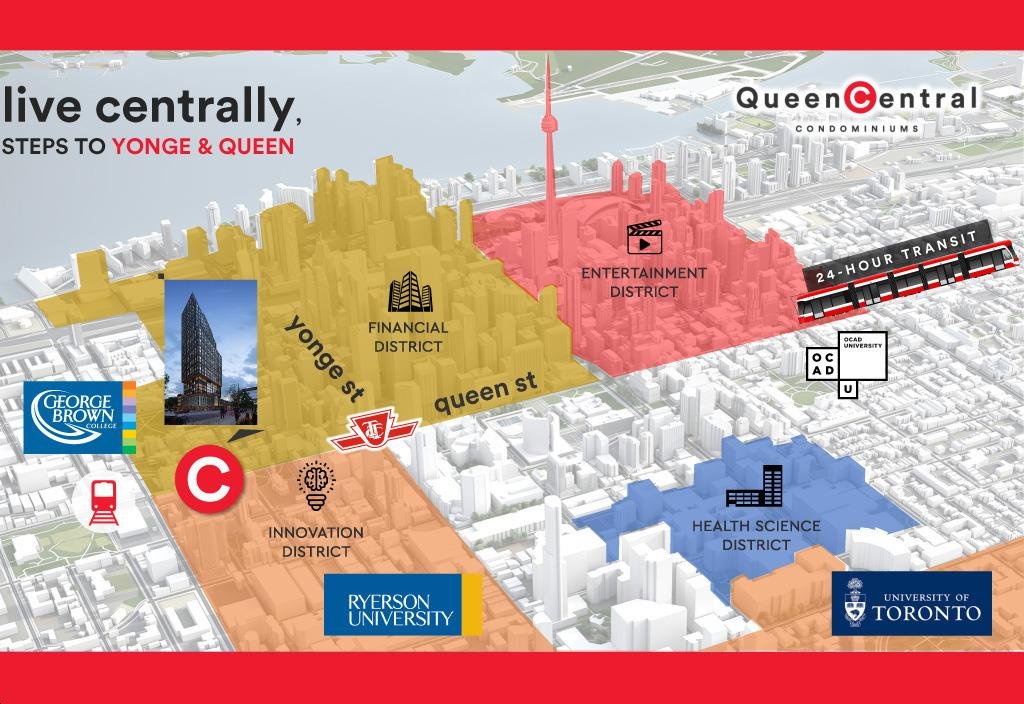 Queen Central Condos is perfect for young professionals seeking a quick commute to major employment hubs such as the Financial District, East Harbour, Tech and Discovery Districts, and Hospital Row. The area is also ideal for post-secondary students, with Ryerson University, George Brown College, the University of Toronto (UofT), and OCAD University just minutes away, making it an excellent choice for off-campus living.