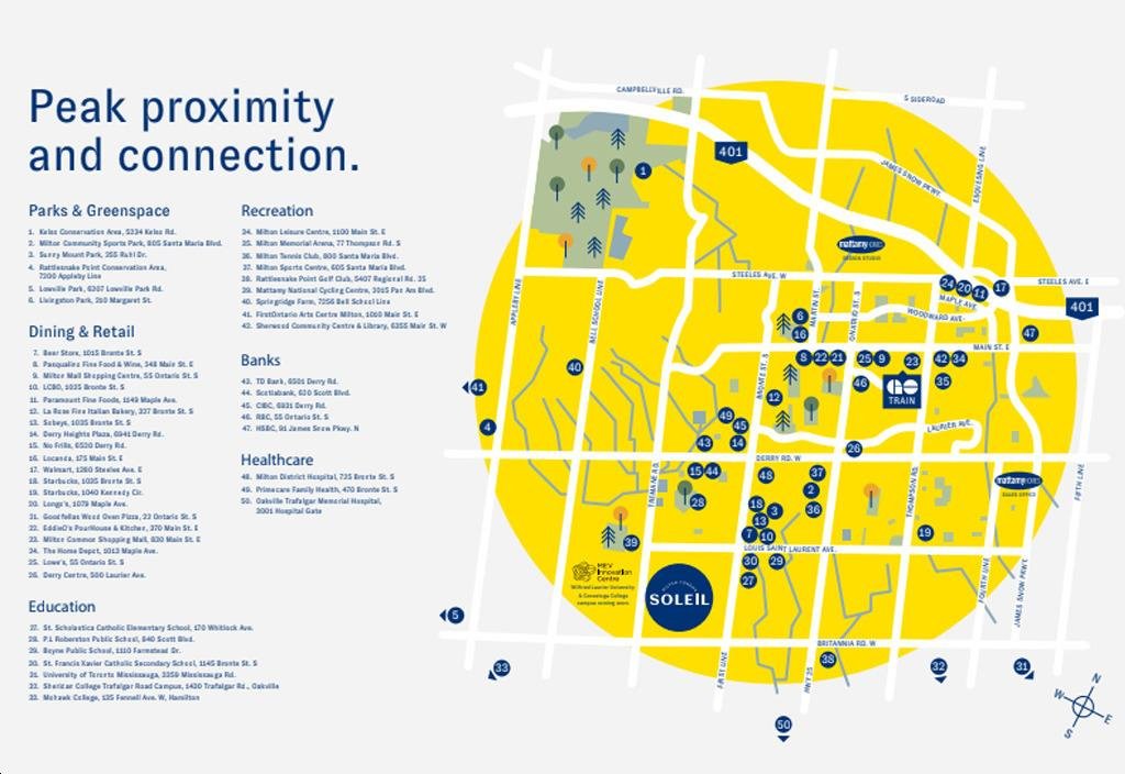 Soleil Condos is perfectly located near Milton’s vibrant downtown core, offering residents easy access to a wide variety of lifestyle amenities, including dining, shopping, and entertainment options. The area is home to a mix of local and brand-name establishments, ensuring everything you need is just a short walk away.