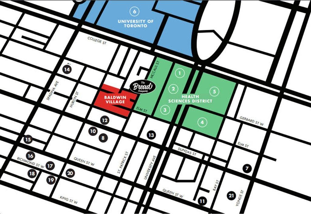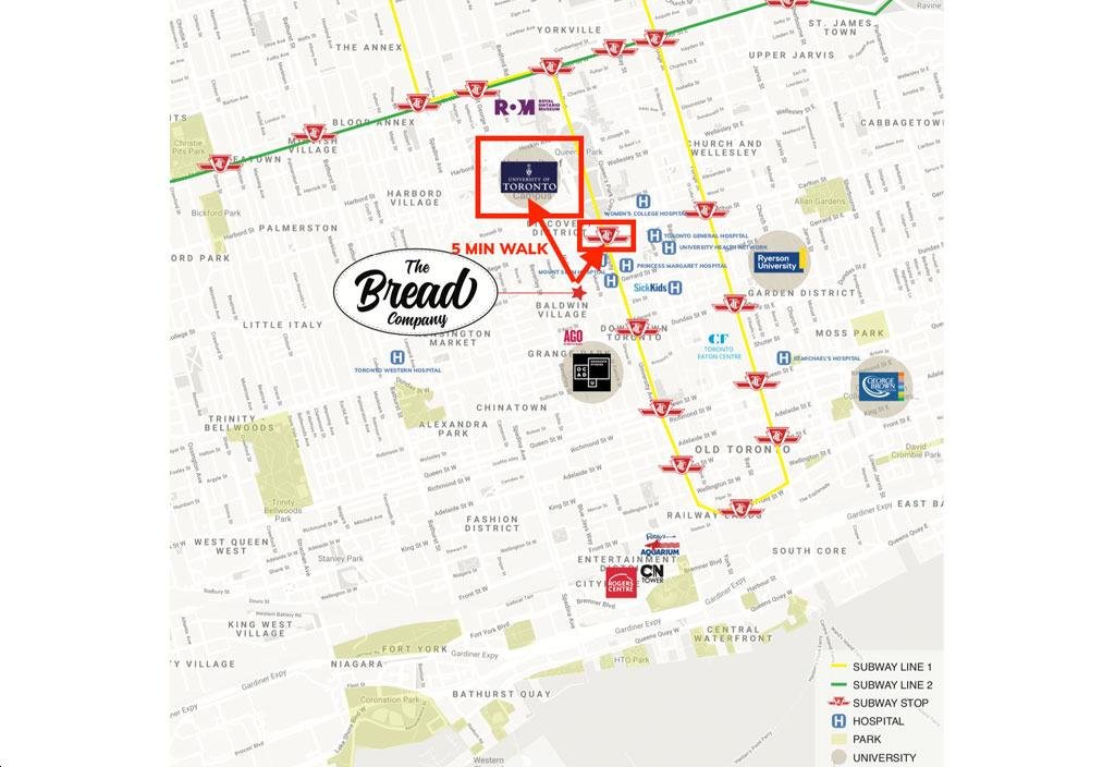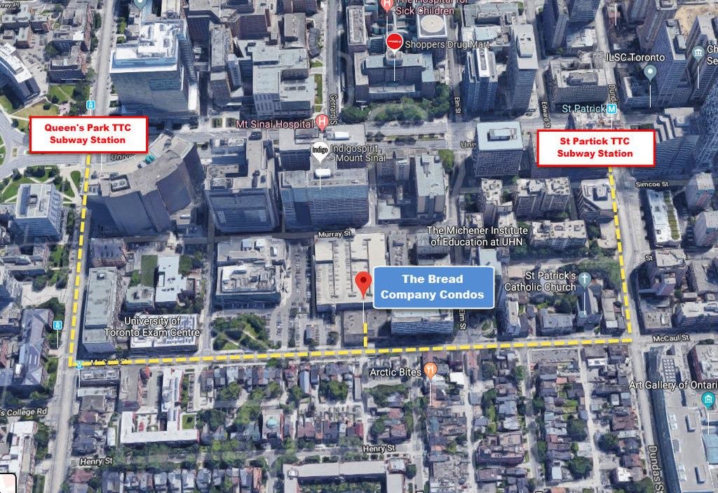 5. The Bread Company Condos boasts a **perfect transit score**, ensuring effortless connectivity to the city. Residents are just a 6-minute walk to **Queen’s Park Subway Station** at McCaul and Baldwin St., while Strachan Ave streetcars are also easily accessible.