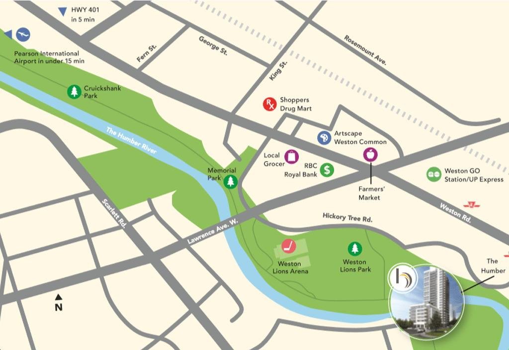 **10 Wilby Crescent** boasts an excellent **Walk Score of 86/100**, meaning everyday errands like grocery shopping, banking, and pharmacy visits are just a short walk away. Public transit options are abundant in this area, with five different bus routes that connect directly to subway lines. The **Weston GO Station** is just a 6-minute walk from **The Humber Condos**, and the upcoming **LRT Station** will provide even more convenience to residents.