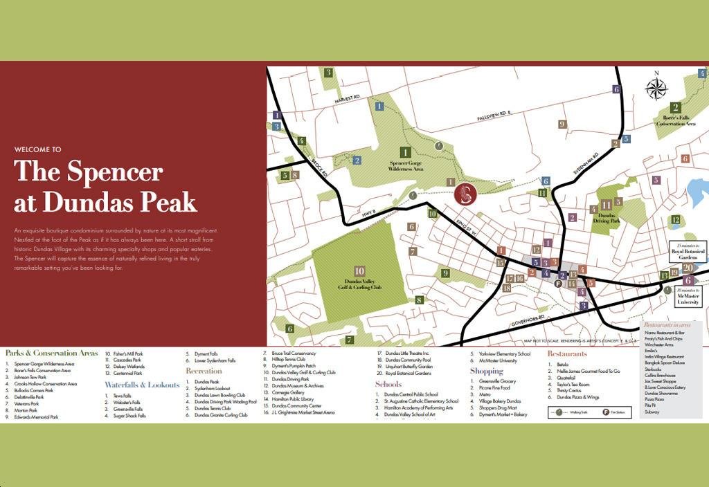 Surrounded by lush green spaces, scenic parklands, protected conservation areas, nature trails, and stunning waterfalls, The Spencer at Dundas Peak is a peaceful retreat in nature. Residents will have year-round access to this picturesque oasis, with Lake Ontario and Hamilton's beautiful waterfront just minutes away.