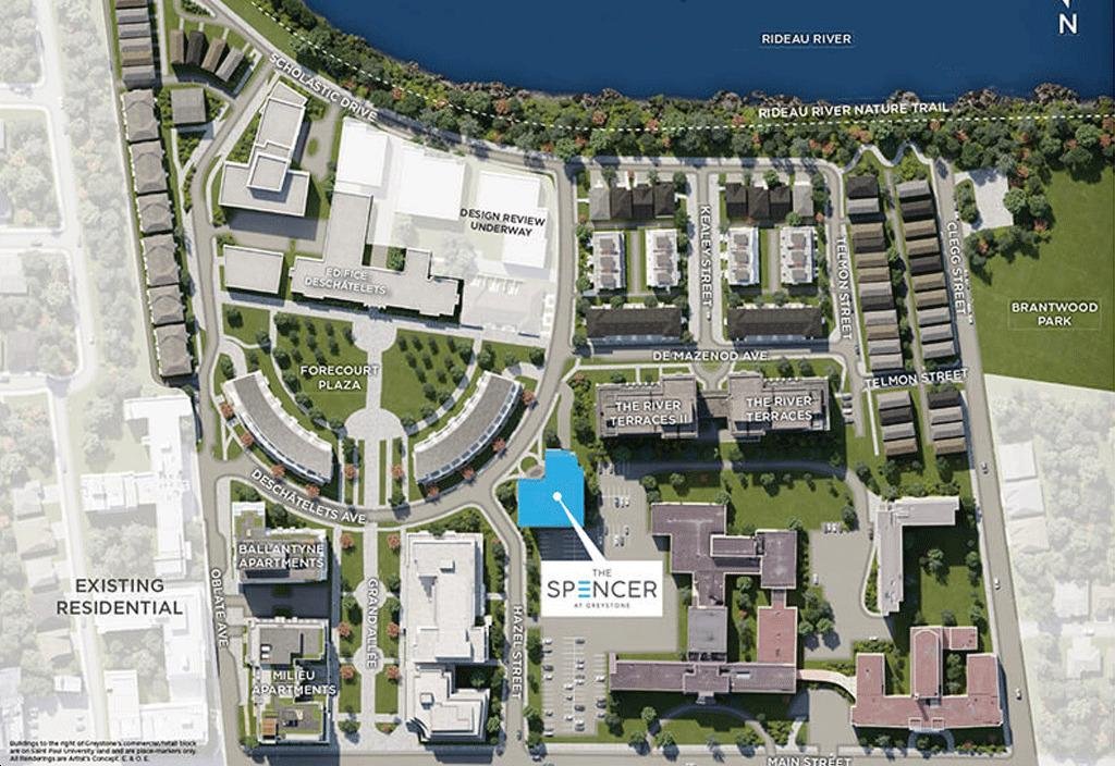 *Greystone Village* is a sought-after and successful master-planned community located in the picturesque and serene neighborhood of Old Ottawa East, just minutes from downtown Ottawa. The latest addition to this beautiful community is *The Spencer*, a 9-storey boutique midrise condominium offering a perfect blend of modern living and natural beauty. This stylish and innovative smart building provides spacious suites with stunning views of the Rideau River and the Ottawa downtown skyline. With exclusive resident amenities and proximity to the best of Ottawa, *The Spencer* at Greystone Village promises an unparalleled lifestyle.