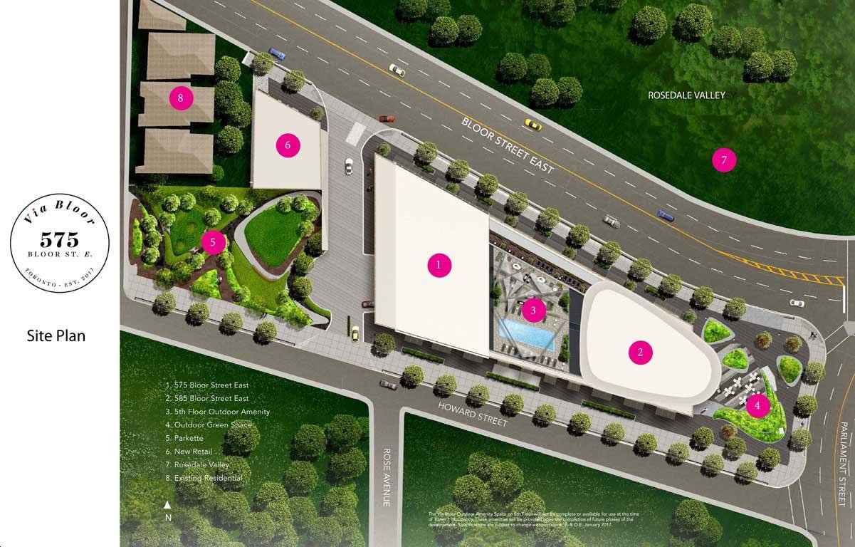 Located at the vibrant corner of **Bloor St E & Parliament St**, Via Bloor Condos is perfectly positioned for young families, university students, and commuters alike. The area boasts an abundance of parks and playgrounds, including **Wellesley Park** and **Rosedale Ravine Land Park**. North-facing units offer beautiful views over **Rosedale Valley**.